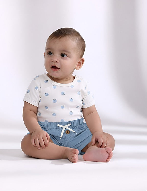 This adorable 2-piece set is designed for comfort and convenience. The top features a round neckline, short sleeves, and easy snap or button closures at the crotch for effortless diaper changes. Paired with matching shorts, this outfit is perfect for your little one's active days. Crafted from soft, breathable fabric, it keeps your baby comfortable and stylish. This set combines practicality with playful charm, and it is ideal for warm weather, making it perfect for casual outings and cozy moments at home.