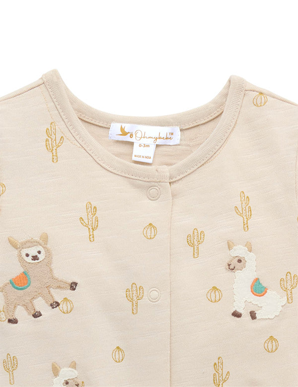 Wrap your little one in comfort and cuteness with this Beige Llama Print Baby Romper. Made from the softest 100% Organic Cotton, it’s gentle on delicate baby skin and perfect for all-day wear. The playful llama embroidery and soothing beige tone bring a cozy charm to your baby’s wardrobe.