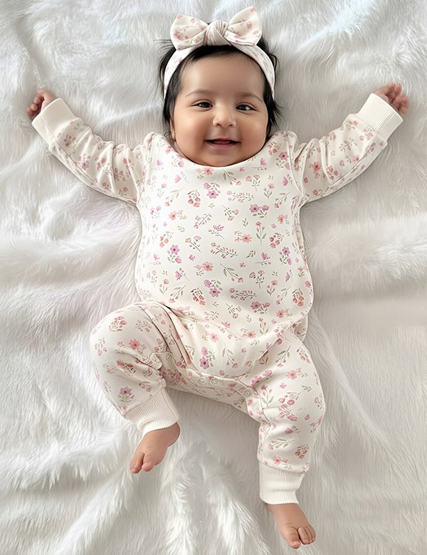 Our soft and practical Printed Growsuit, paired with a matching bow headband, is the perfect addition to your little one's wardrobe. Designed for comfort and ease, this growsuit features cuffs on the sleeves and legs, providing a snug fit that ensures extra comfort throughout the day. Made from 100% Organic Cotton, it offers a gentle and soft touch against your baby's delicate skin, making it ideal for sensitive skin. Whether for playtime or a cozy nap, this set will keep your baby feeling comfortable and stylish.