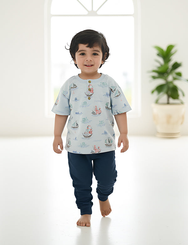 Give your little one the perfect blend of comfort and style with this 2-piece Henley set. Featuring a playful Pirate Ship printed Henley tee made from 100% organic cotton slub jersey, it’s soft, breathable, and ideal for everyday wear. The matching indigo mélange pants are crafted from a brushed fleece blend for a cozy feel, keeping your baby warm and comfy all year round. Designed with an elasticated waistband and ribbed cuffs, this set ensures a snug fit for active little explorers.