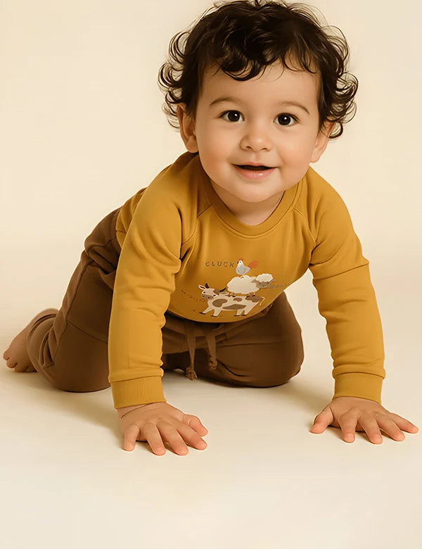 Let your little one play, move, and giggle in Oh My Bebe’s Organic Cotton Farm Animal Top & Jogger Set. This comfy 2-piece outfit includes a mustard full-sleeve top with cute farm animal embroidery and soft brown joggers crafted from breathable organic cotton.