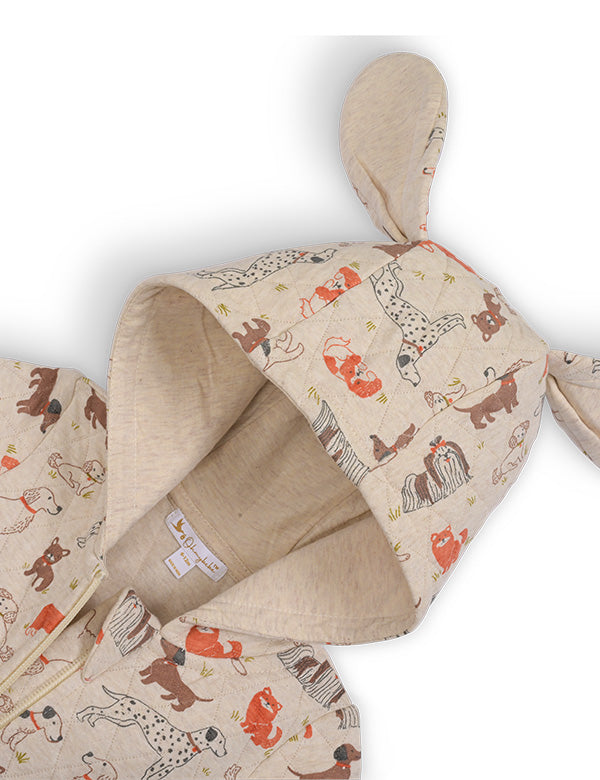 The charming dog-themed print brings joy and playfulness to every moment, while the earthy wheat-coloured base adds a warm, premium feel that parents love. The standout feature? The cute 3D doggy ears on the hood, making your baby look irresistibly sweet and picture-perfect!