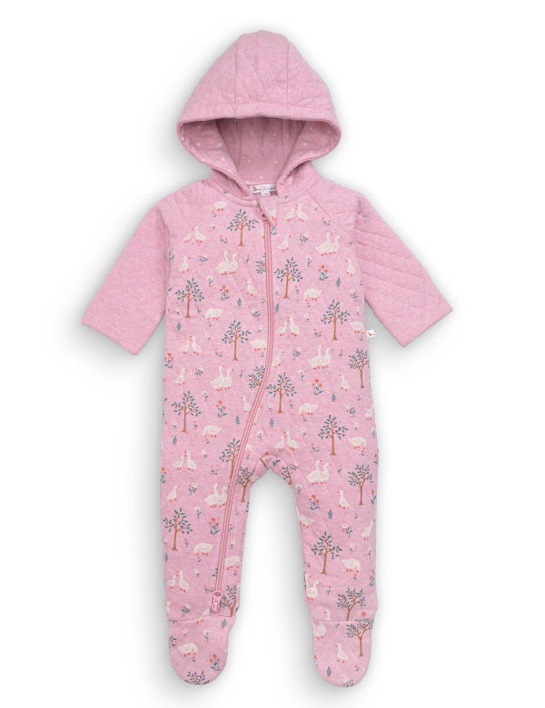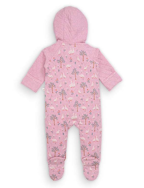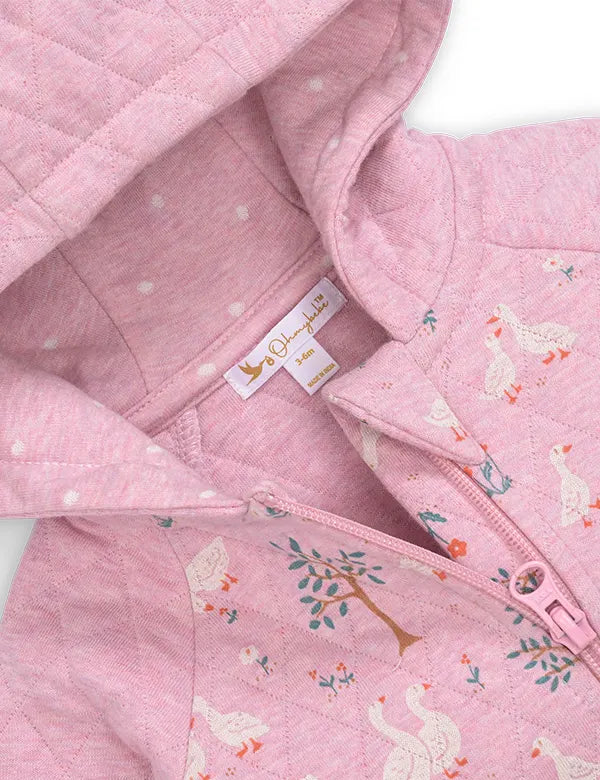 The beautiful pink pastel base paired with cute duck, swan, and forest illustrations creates a dreamy, storybook-like feel that parents instantly fall in love with. The quilted pattern on the sleeves and hood adds premium texture and extra warmth — ideal for mild winters, breezy evenings, and AC-cooled rooms.